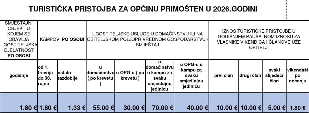 Naša Općina Primošten naplaćuje turističku pristojbu prema važećim propisima za 2026. godinu. Molimo vas da se upoznate s visinama naknada u priloženoj tablici.